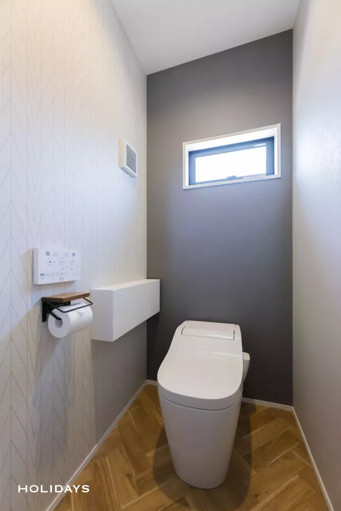 濃淡の違うグレーと木目を巧みに組み合わせた、北欧ナチュラルテイストのお住まい。メインクロスや扉にはグレーを、メインフロアをはじめ、タイルデッキ・玄関天井・トイレには美しい木目の素材を採用してオシャレな空間に。どの箇所においてもグレーと木目の相性が抜群のまとまりのある空間に仕上がりました。また1階部分は階段を中心に回遊性のある行き止まりのない造りにしたり、階段下の空きスペースを収納スペースとして活用するなど、間取りの工夫満載なお住まいが完成した。