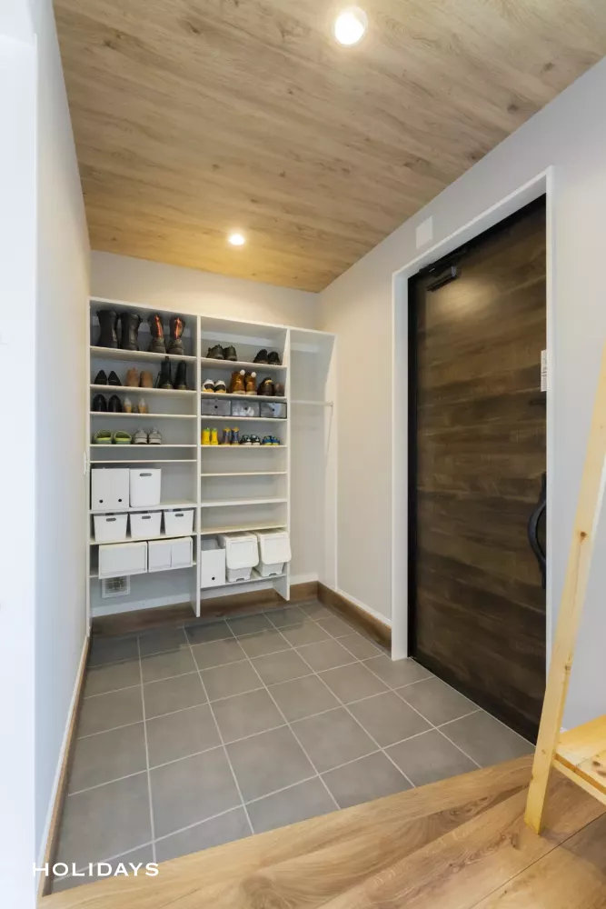 玄関では、天井に木目を採用。ナチュラルで暖かな印象に。