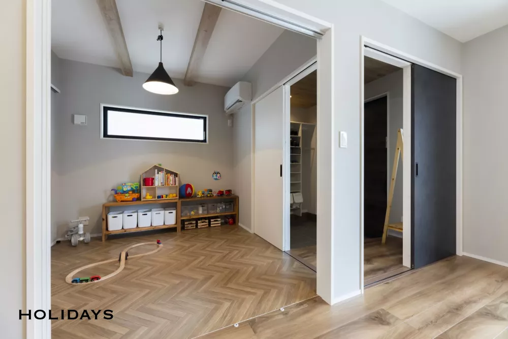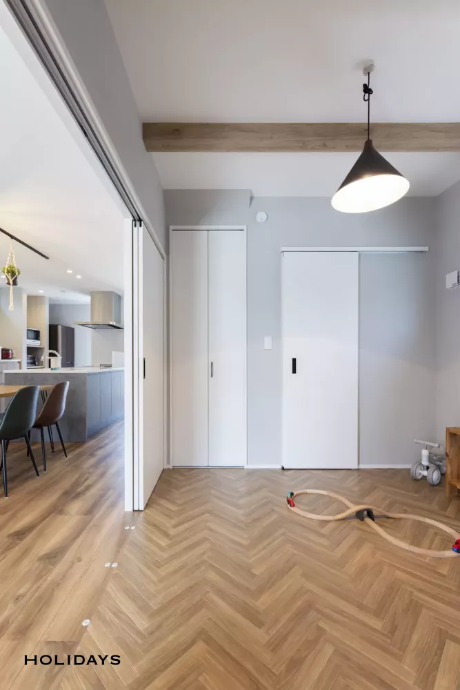 LDK横の洋室は床をヘリンボーン貼りにし、一味違った印象に。