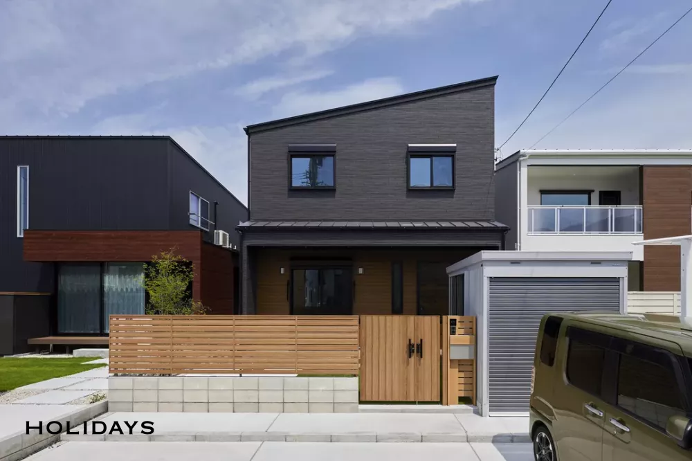 石目調チャコールの外壁をメインに木目調ブラウンのアクセントを採用したスタイリッシュな外観。