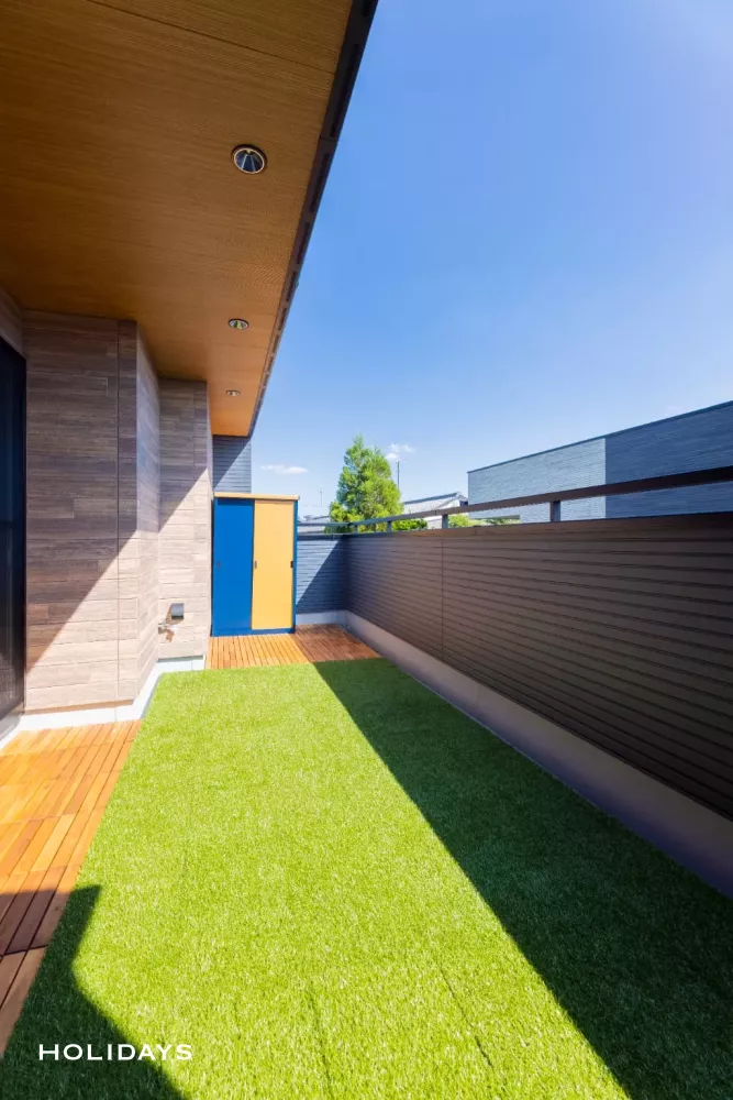 内観・外観に木調の素材を取り入れ、シンプルで温かみのある空間にまとまったお住まい。2階リビングの間取りを採用し、絵画が飾ってあるこだわりの階段を上ると、開放的なLDKに繋がる。プライバシーを確保しながらも、明るく開放的な空間に仕上がった。LDKから繋がるバルコニーでは、ご家族だけでなくご友人を招いてもゆったり過ごせる程のスペースが確保されている。また、リビングに続く小上がりの畳スペースには一見では分からない隠し扉が設置されており、細かなところまで施主様の工夫が詰まったオリジナルな一邸完成した。