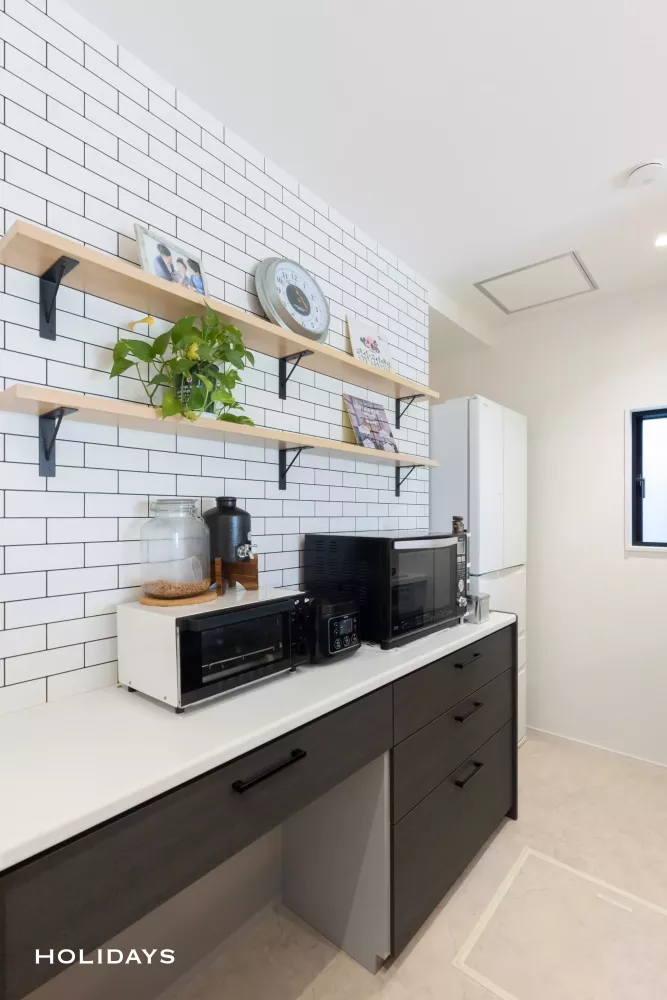 タイル柄のクロスと見せる収納で、引き締まったオシャレな空間に。