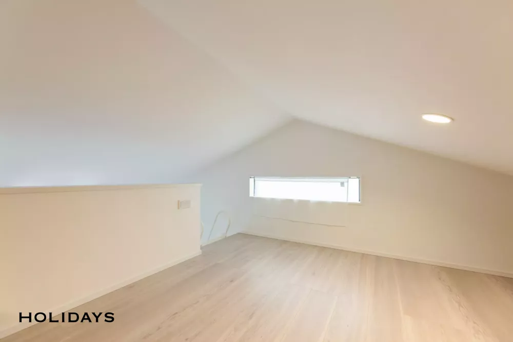 白で統一した寝室には、勾配天井を生かしたロフトを設置。