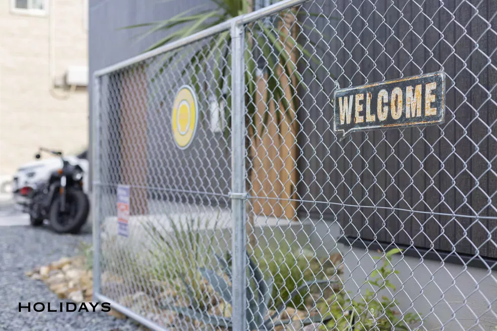 玄関前の金網フェンスはアメリカンな雰囲気を感じさせる