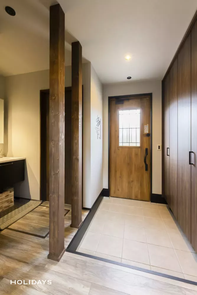 木の質感を生かした温かみのある玄関。オイル塗装を施した化粧柱が緩やかに空間を仕切っている