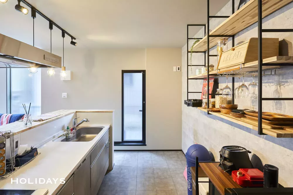 キッチンの背面に造作棚をあしらえた。収納も、インテリアの一部とし目を引くポイントに