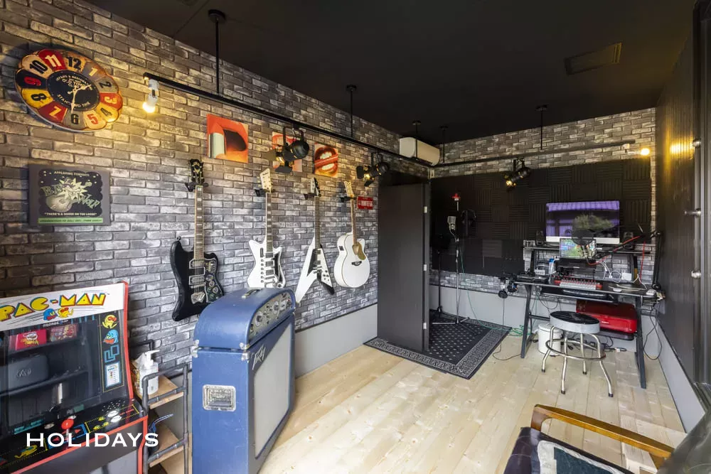 ガレージを上手く活用したご主人様のスタジオ兼仕事スペース。ギターを飾ったり、ステージを設置したりとご主人様のこだわりをふんだんに詰め込んだ