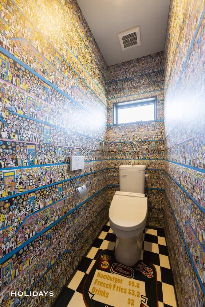 「ウォーリーを探せ」のアクセントクロスと市松模様のクッションフロアを採用した遊び心のあるトイレ