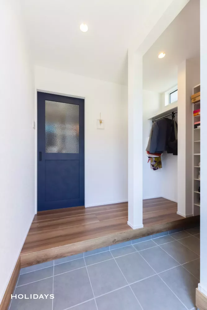 ホワイトクロスに映えるネイビーの扉が出迎えてくれる爽やかな印象の玄関
