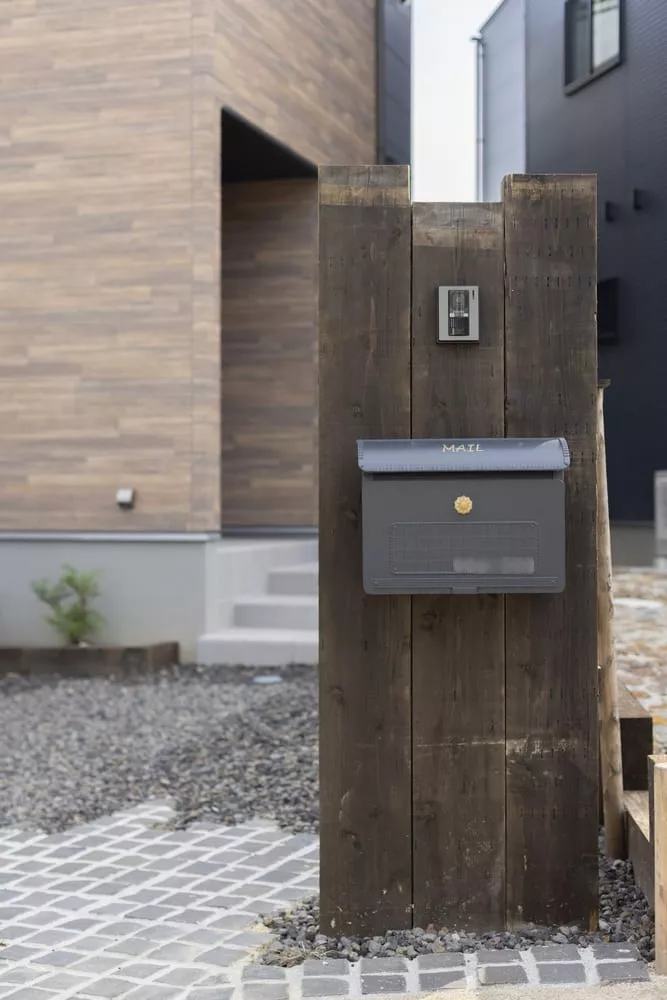 溶岩石とピンコロ石で仕上げた駐車スペースと枕木を使用した門柱が統一感を感じさせ、オシャレな雰囲気を生み出している