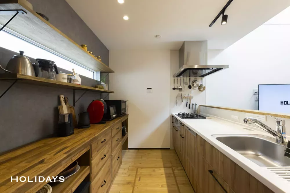 キッチン背面の取り付け棚は見せる収納で、オシャレなインテリアとして活用できる