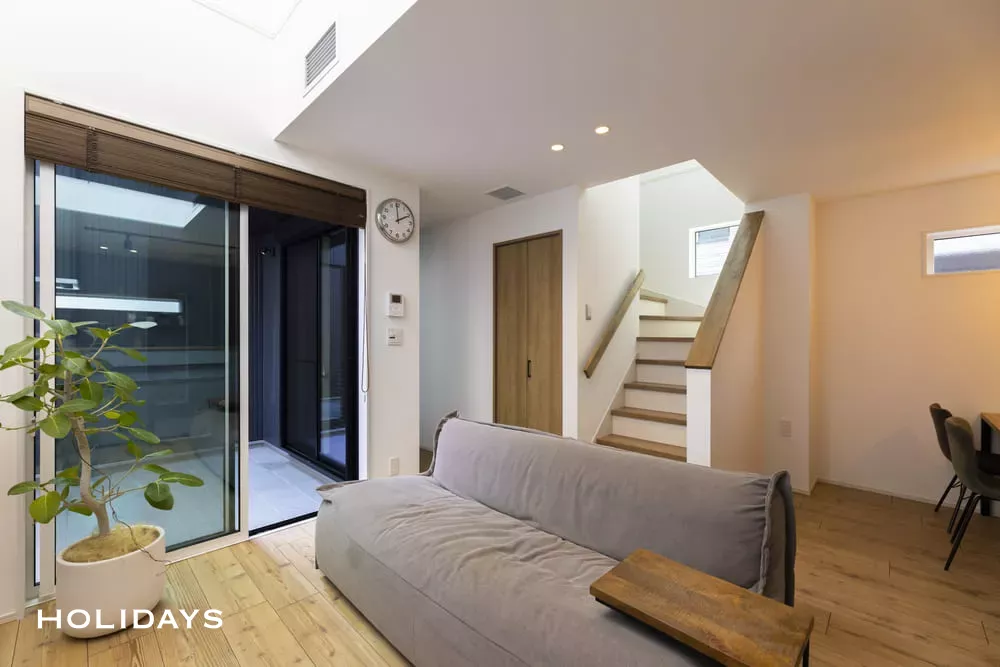 デザインだけでなく高い機能性も併せもつお住まいにしたいというご要望から全館空調のご提案をしたところ、1年中快適な気温で過ごせる点に魅力を感じていただきました。快適さだけではなく、玄関から建具を1本も使わずLDKに繋がる動線・吹き抜けの採用は、全館空調だからこそ取り入れることができる間取りです。また、中庭・2階の屋根付きバルコニーなどを設け、趣味の場として活用でき、開放感のあるデザインになっています。家中全ての場所に施主様のこだわりの詰まったお住まいが完成しました。