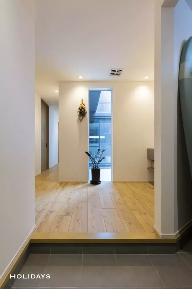 玄関の窓から中庭、更にその先にはLDKが見える間取りは、視線の抜けをつくることで開放感のある空間に仕上がった