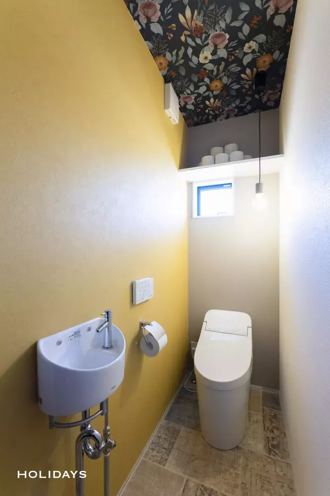 トイレは四方に異なるアクセントクロスを貼り分け、遊び心溢れる空間に仕上がった