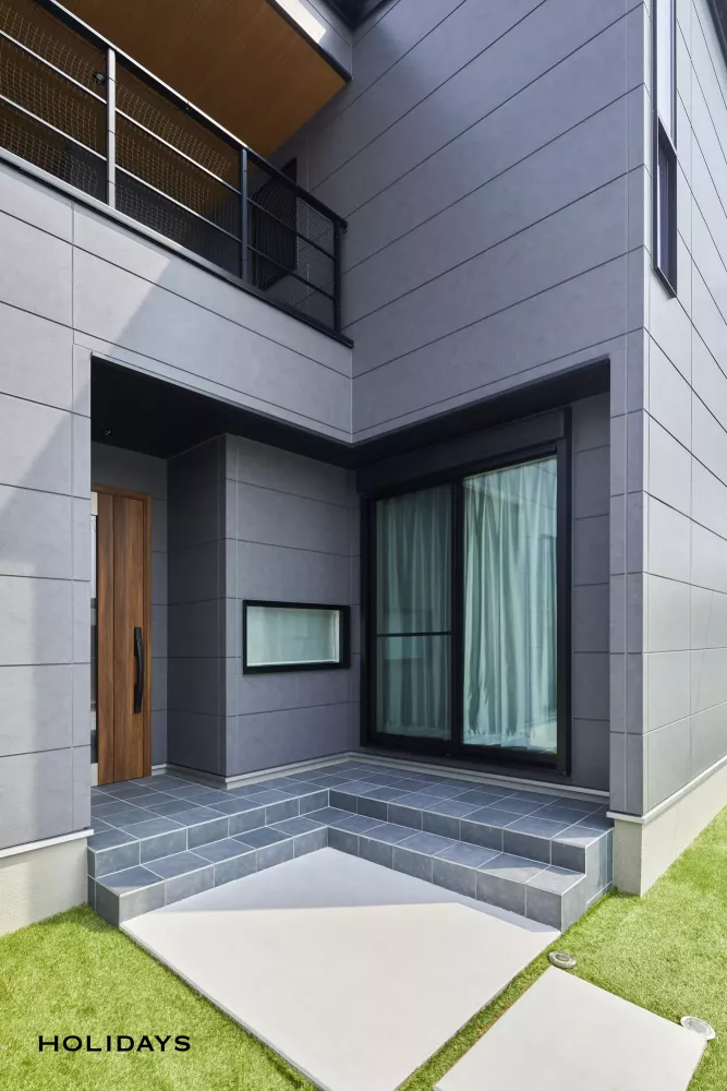 グレーとブラックを組み合わせたスタイリッシュな外観。内観は、木目×ダークカラーのナチュラルなデザインで、統一感のあるナチュラルテイストな空間に仕上がりました。