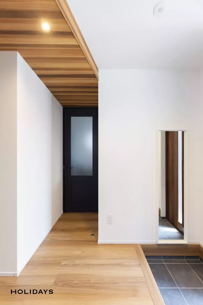 殺風景になりがちな玄関に木目調の下り天井を設け、空間のアクセントに