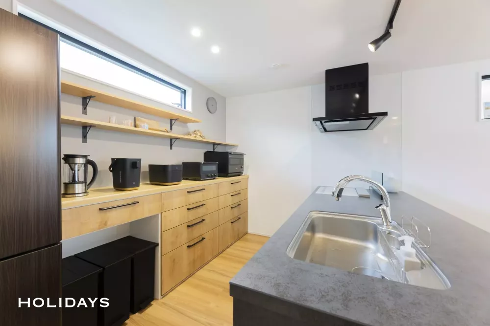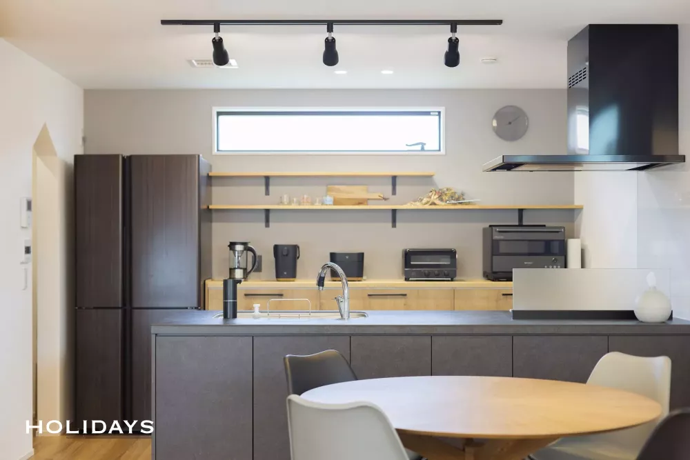 ダークトーンでまとめたキッチンは、シンプルでモダンな大人の空間に