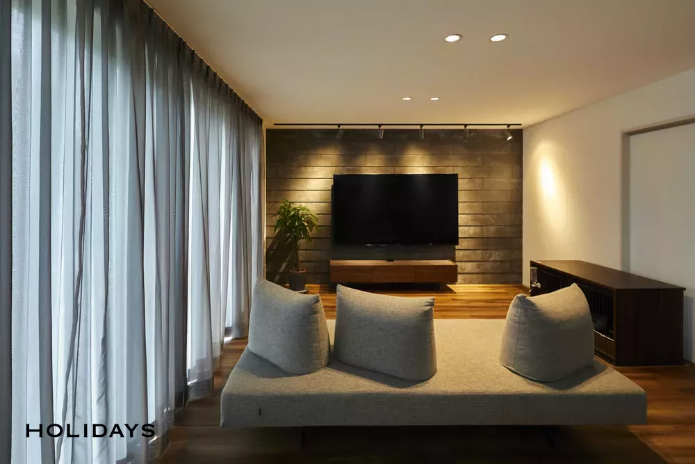 テレビ背面は、セメントの質感を活かした無垢の建築素材「SOLIDO」を採用。西側壁面にラップ貼りし、空間を引き締めている
