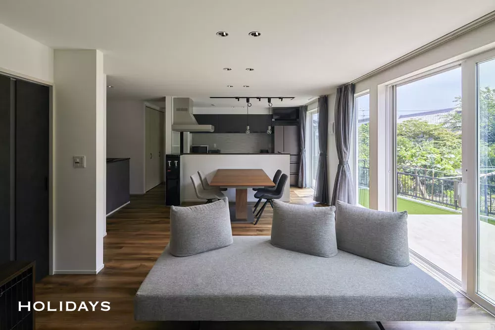 連続した掃き出し窓から自然が愉しめる家。LDKと庭を繋げることで開放感が生まれ、光と風を感じるお住まいが完成した。