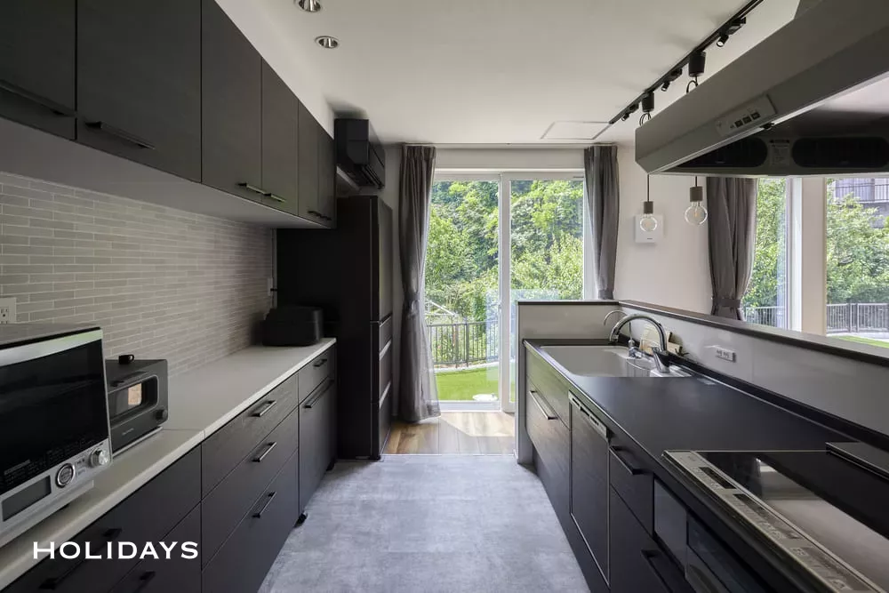高級感を醸し出すブラックカラーのキッチン。カップボード上に設けた吊り棚は収納力抜群