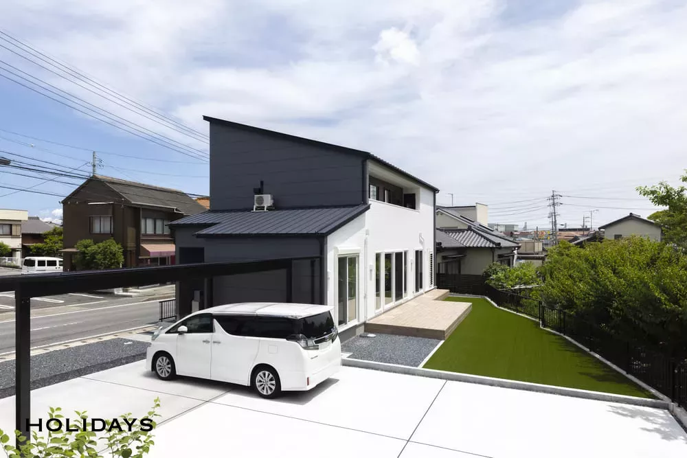 ダークグレーの外壁とホワイトの外壁を道路側とお庭側で貼り分けたオシャレな外観