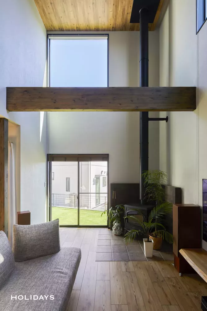 吹き抜けと大開口窓から自然が愉しめるスモーキーカラーの家