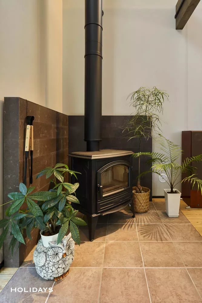部屋中に温かい空気がいきわたる薪ストーブはデザイン性も高く、炎の揺らぎはリラックス効果も生まれる