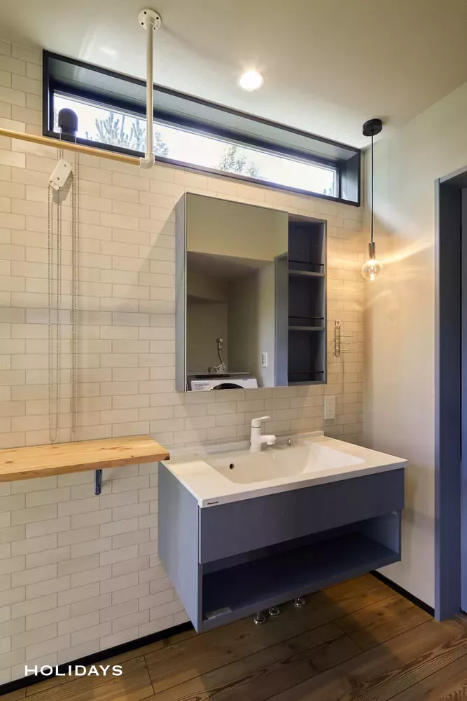 ホワイトタイルが清潔感を感じさせる洗面台。上部に設けた開口窓から木々と空のコントラストが愉しめる