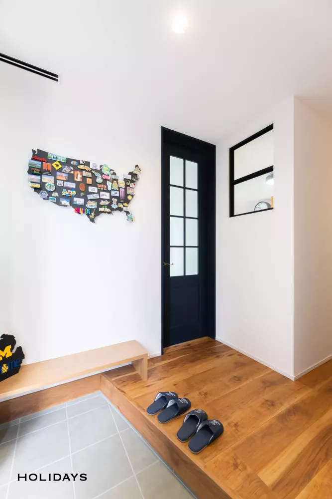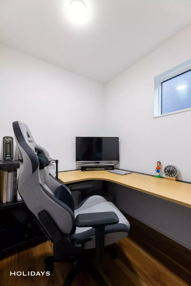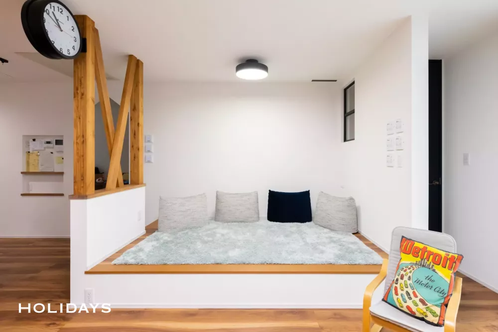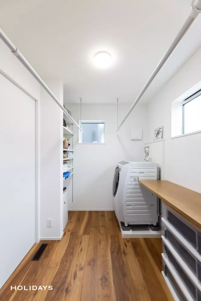 外観は直線的なカッコよさが映えるダークトーンでまとめ、内装はナチュラルテイストをベースに、遊び心溢れるデザインとなっています。洗濯動線のまとまった間取りや約3.5帖の広々としたパントリーを採用しており、デザインだけではなく住みやすさにもこだわったお住まいに仕上げました。また、HOLIDAYSオリジナル全館空調の「AIRAQ(エアラク)」を搭載しているので、一年中快適でお過ごしいただけます。