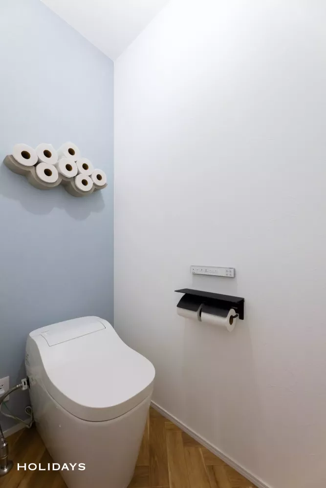 見せながら収納ができる雲形のペーパーホルダーを設置。ライトブルーのクロスにグレーのホルダーが映え、目を惹く空間に