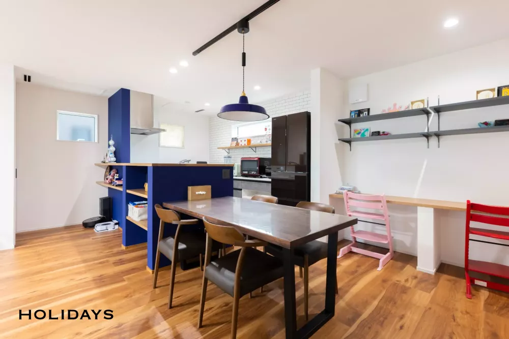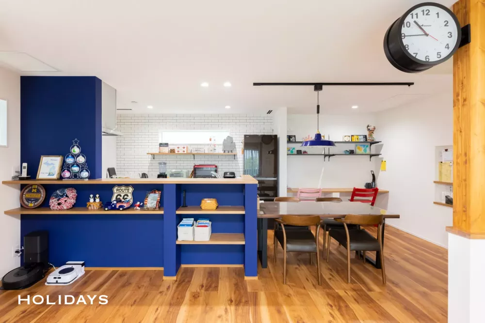 ブルーのアクセントクロスに目を惹かれるキッチン。腰掛部分には棚を造作し、小物のディスプレイも可能