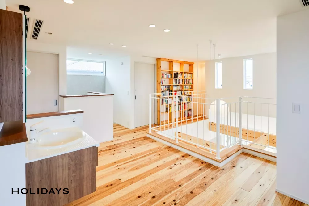 リビングとホールには種類の違う無垢材を使用することで、雰囲気に変化をつけつつ、全体として柔らかく味のある印象に仕上げています。性能面を重視されているとのことで、全館空調だからこそできる吹き抜けや広々とした2階ホールの間取りに満足いただけました。コンパクトにまとめながらも、圧迫感のない快適なお家となっています。
