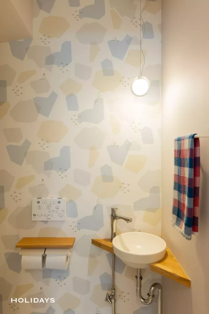 トイレにはコーナー部分をうまく活用した造作手洗器を設置。かわいらしい球体のペンダントライトが印象的