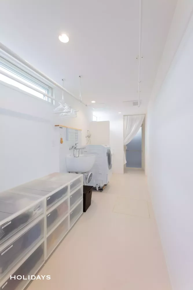 洗面脱衣室からサンルームまでの約7mを仕切ることなく繋げ、「入浴」「洗面」はもちろん「洗濯→干す→収納」まで一か所で完結する間取りにしている