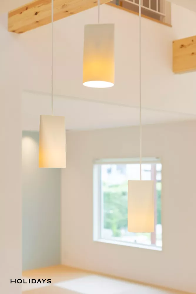 吹き抜けにはデザイン性の高いMOEBEのペンダントライトを使用することで、LDKがより華やかに